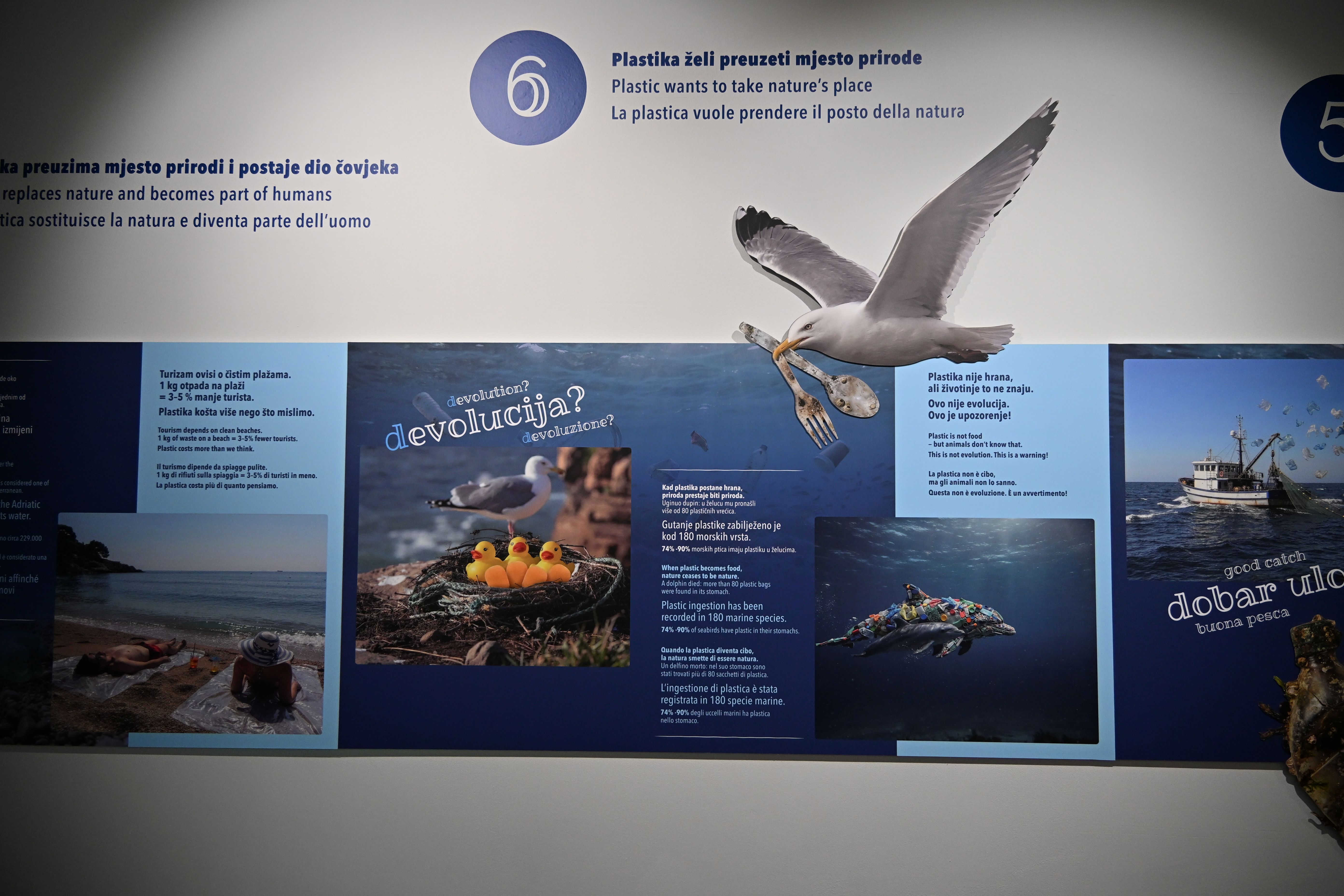 Posebnost izložbe je njezin smještaj u trgovačkom centru, prostoru svakodnevne potrošnje, čime se posjetitelje dodatno potiče na promišljanje o vlastitim navikama i utjecaju na okoliš. Kroz inovativan pristup i jasne interpretacijske poruke, izložba obrađuje ekološke, gospodarske i društvene posljedice morskog otpada.