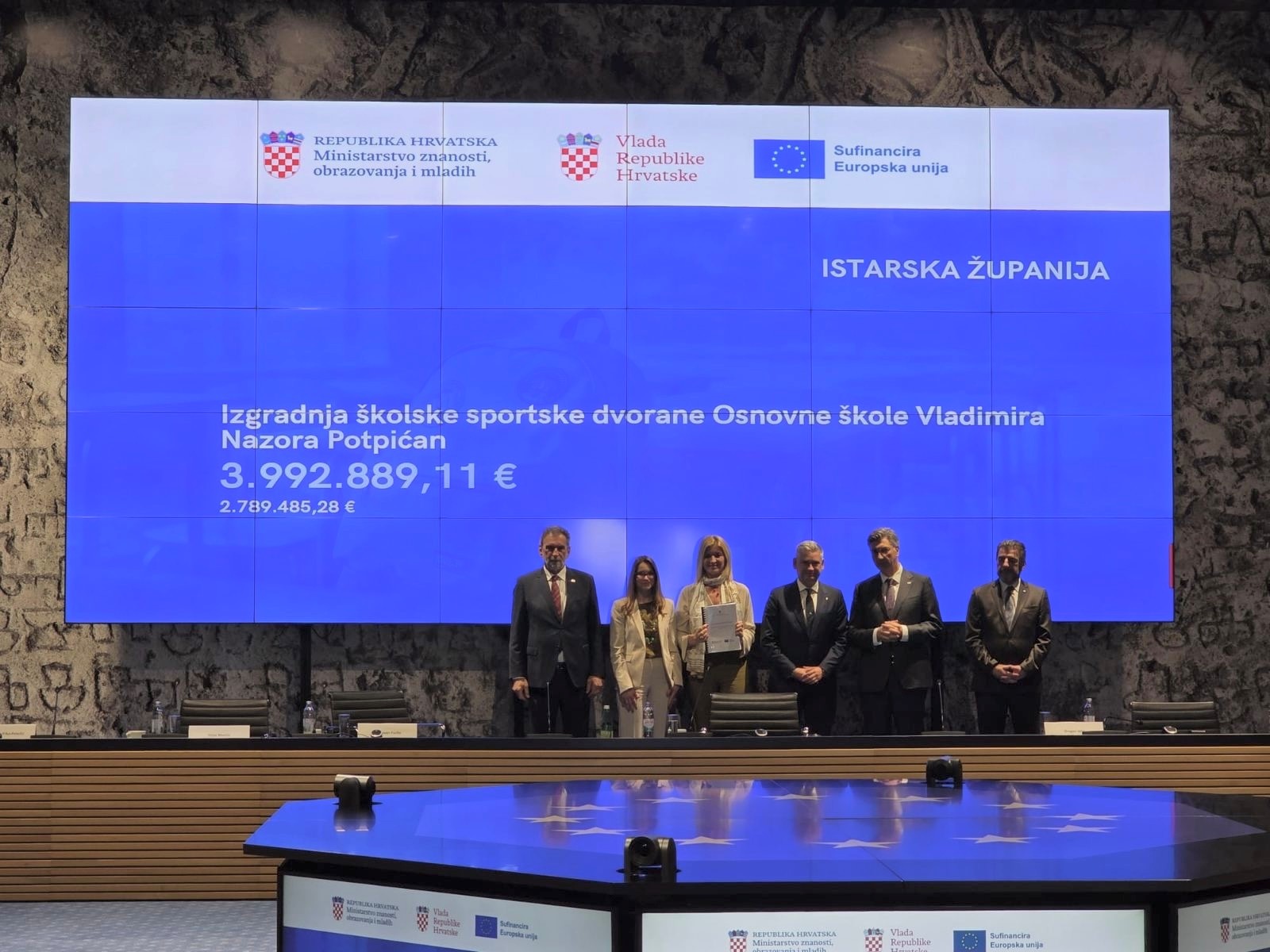 Župan Boris Miletić danas je u Nacionalnoj i sveučilišnoj knjižnici u Zagrebu sudjelovao na potpisivanju i svečanoj dodjeli ugovora za Poziv „Izgradnja, rekonstrukcija i opremanje osnovnih škola za potrebe jednosmjenskog rada i cjelodnevne škole“. U okviru Poziva Istarskoj županiji odobrena su bespovratna sredstva za provedbu projekta „Izgradnja školske sportske dvorane Osnovne škole Vladimira Nazora Potpićan“. Ugovor su županu Miletiću uručili predsjednik Vlade Republike Andrej Plenković i ministar znanosti, obrazovanja i mladih Radovan Fuchs.