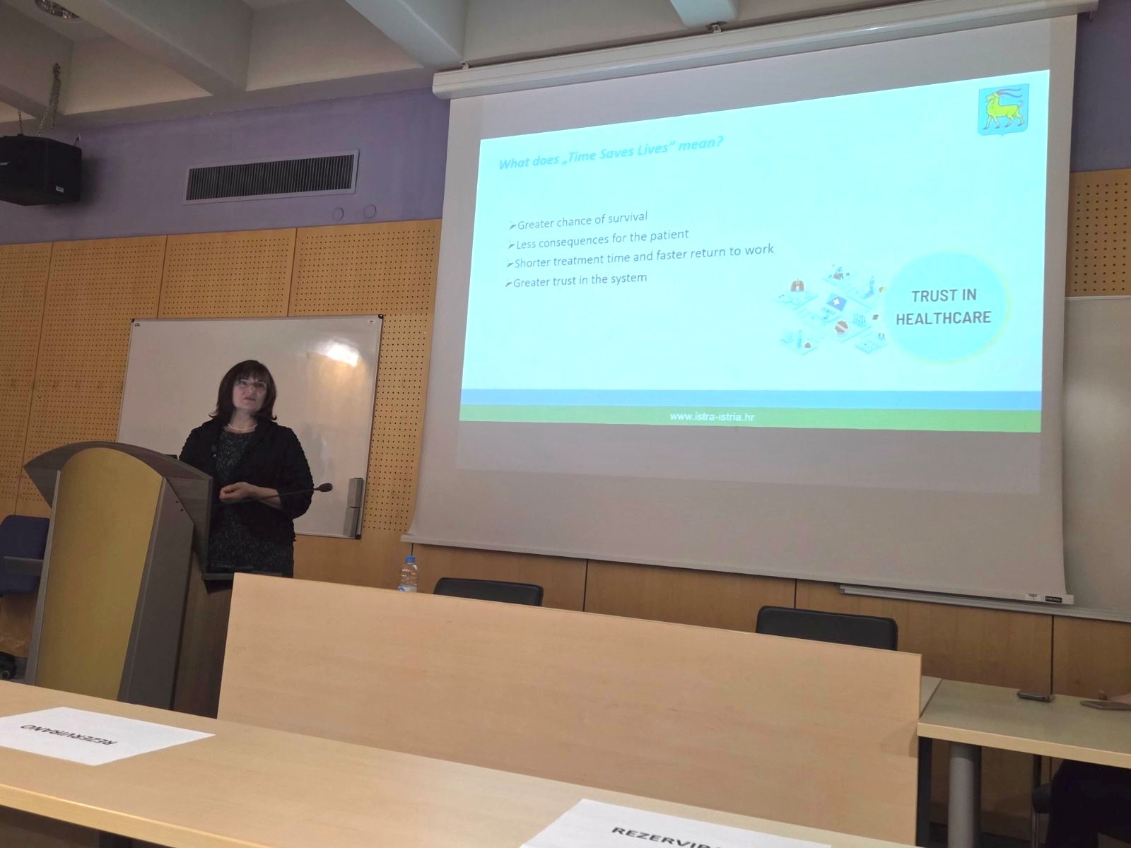 U svom izlaganju predstavila je razvoj i značaj suradnje između Istarske županije i slovenske Obalno-kraške regije, s posebnim naglaskom na važnost pravovremenog pružanja zdravstvene skrbi u hitnim slučajevima. Istaknula je kako udaljenost do najbliže bolnice često presudno utječe na ishod liječenja, zbog čega je prekogranična suradnja ključna za spašavanje života.