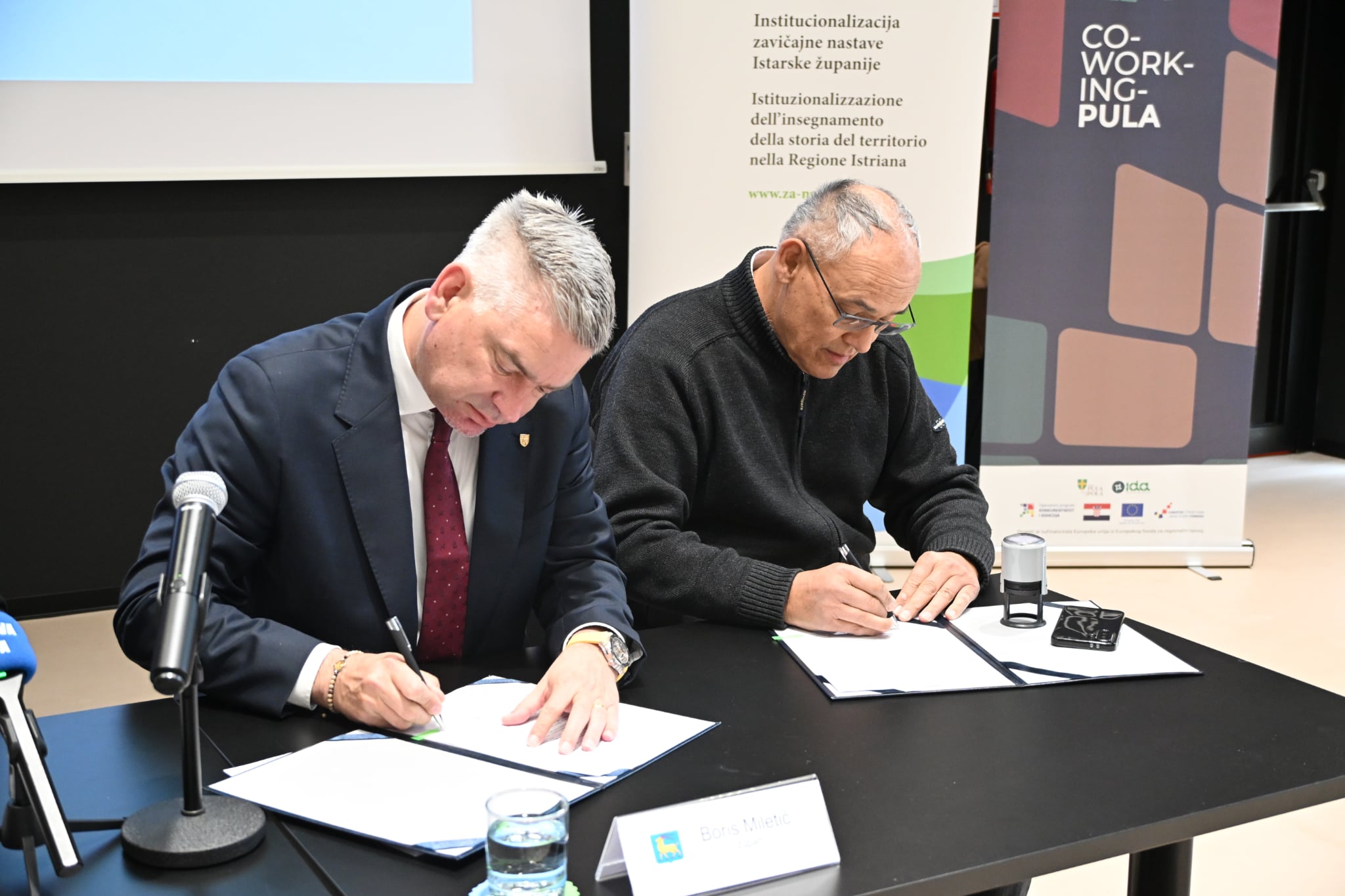 U proračunu Istarske županije za 2026. godinu za financiranje javnih potreba u kulturi osigurano je ukupno 1.078.444 eura, a danas je u Coworking centru Pula održano novo potpisivanje ugovora, odnosno nastavak dodjele financijskih sredstava. Ovaj put župan Boris Miletić potpisao je 21 ugovor s 12 korisnika, u ukupnoj vrijednosti od 98.060 eura, a riječ je o projektima i programima koji se odnose na materijalnu i nematerijalnu baštinu. Potpisivanju je prisustvovao i pročelnik Upravnog odjela za kulturu i zavičajnost Vladimir Torbica.