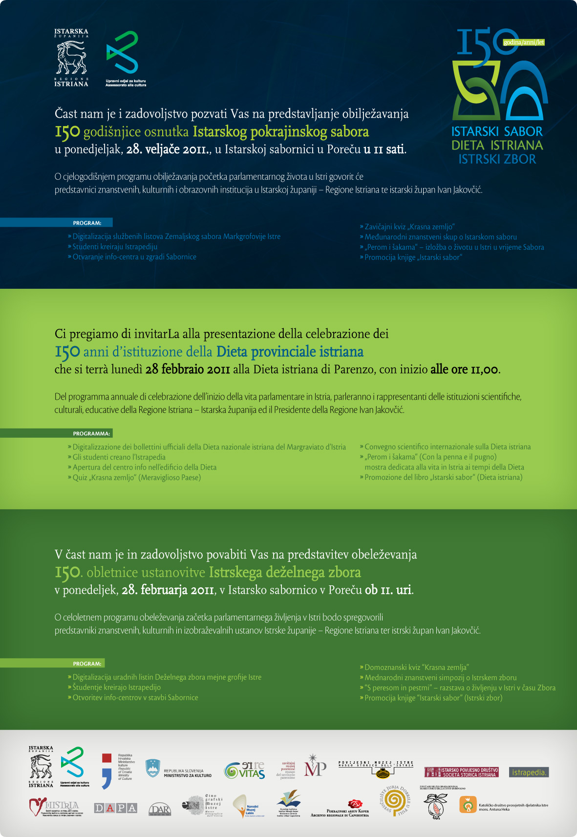 In occasione dei 150 anni di vita parlamentare in Istria, la Regione Istriana - Istarska županija organizza la presentazione del programma annuale per celebrare l'istituzione della Dieta provinciale istriana.